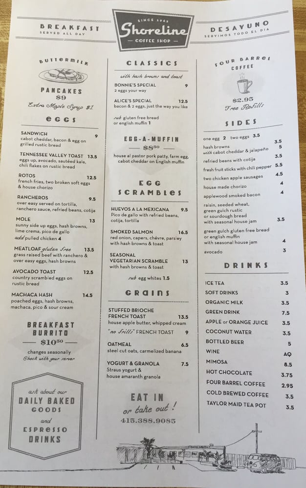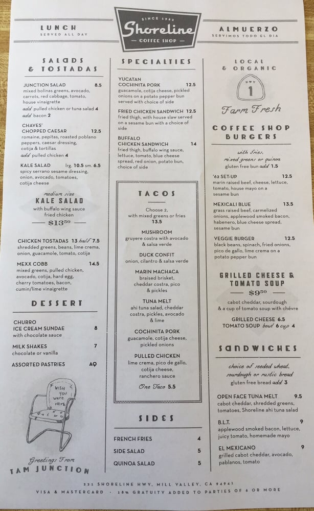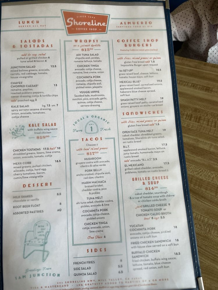 Located in Mill Valley, CA, Shoreline Coffee Shop offers a charming retro diner vibe with authentic design and excellent service. The menu features breakfast, brunch, and lunch options with vegan and limited vegetarian choices. Customers rave about the friendly staff and fresh, delicious food prepared quickly. The breakfast sandwich is a must-try, according to Sarah P., who praises it as the best in Marin. Matt J. appreciates the old school diner atmosphere and the attentive servers, while Jason W. commends the fantastic food and amazing staff. Jillian R. insists there is nowhere better for breakfast or lunch, and Zephrin L. considers Shoreline his home away from home. With a diverse menu, welcoming atmosphere, and top-notch service, Shoreline Coffee Shop stands out as a beloved institution in Mill Valley.