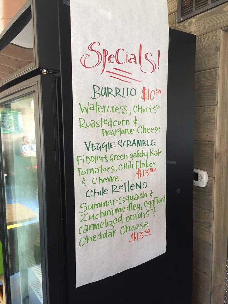 Scrambled eggs in a spinach tortilla, mustard greens, caramelized onions, mushrooms,cheddar cheese and bacon, Today’s offering